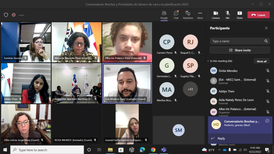 Santo Domingo. El Ministerio de la Mujer y el Ministerio de Economía, Planificación y Desarrollo, realizaron de manera virtual el conversatorio “Brechas y Prioridades de Género de Cara a la Planificación 2023, dirigido a las Unidades de Igualdad de Género (UIG) de 30 instituciones públicas.