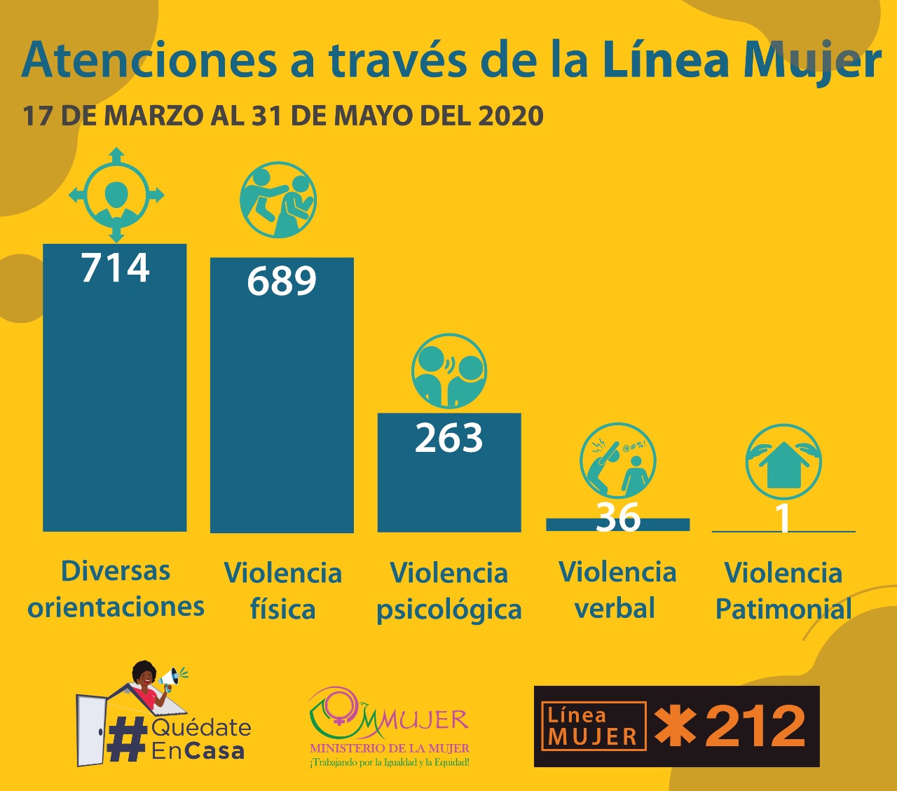 Según el “Resumen de Datos Estadísticos en período de cuarentena” que realiza el MMujer, la línea Mujer*212, en coordinación con el Sistema Nacional de Atención a Emergencias y Seguridad 911, ha recibido 1,703 llamadas, de las cuales 714 fueron para solicitar orientaciones, en su mayoría sobre las ayudas económicas que ofrece el Gobierno en cuarentena, por lo que fueron referidas al Sistema Único de Beneficiarios (SIUBEN); 689 usuarias llamaron para denunciar violencia física; 263 dijeron haber sido violentadas de manera psicológica; 36 denunciaron violencia verbal y una denunció violencia patrimonial.